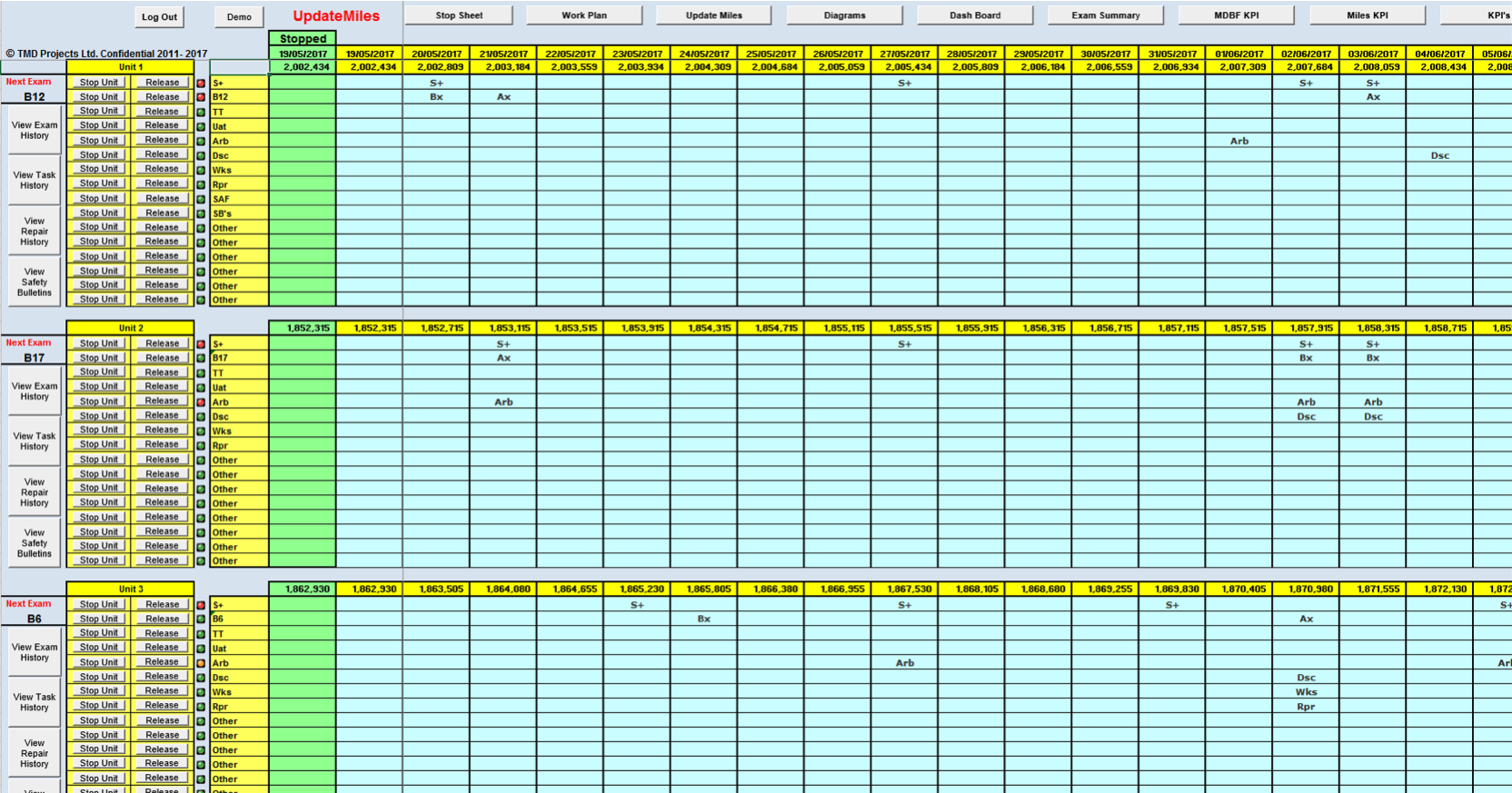 The model provides a maintenance radar including all planned and scheduled work activities for the fleet. The model also has the capability to accept repairs, defects and safety bulletins. A stop-sheet is automatically populated, providing 24/7 recording and management of trains stopped for maintenance.
